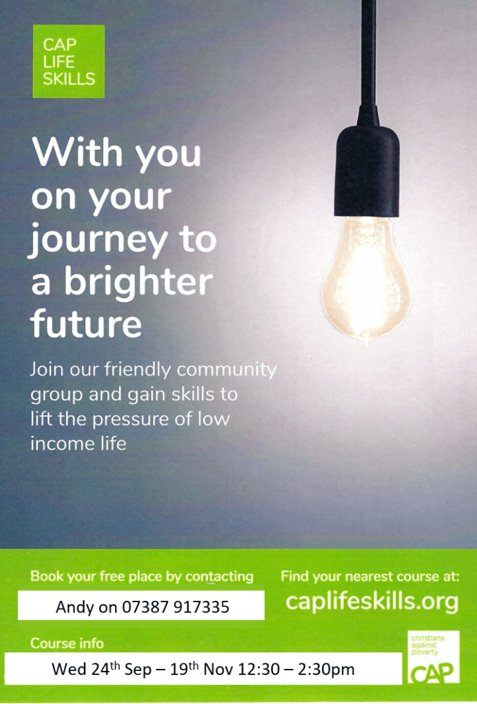 Come join our friendly community group at our free Life Skills course. This is for anyone who wants some extra support and practical advice on how to manage their finances on a low income, or even just to further your financial management skills. Contact Andy on 07387 917335 for further enquiries or to book on the next course. More information can also be found on the CAP website: