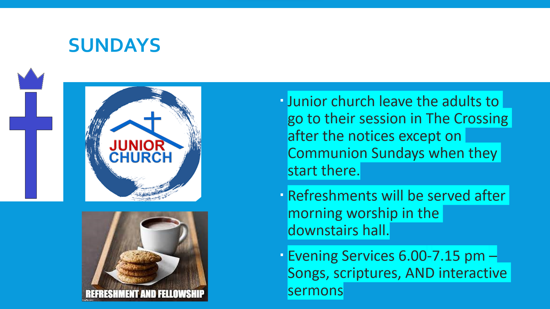 We have regularly weekly services, groups, activities and events for all ages. Please see below: